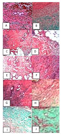 Histological and morphometric findings: There were significant differences in comparisons of group V and IV, particularly in terms of cellular infiltration, acute hemorrhage, congestion, edema, collagen production and density, reepithelialisation and neovascularization. During the study period, scores for reepithelialisation and neovascularisation were significantly higher in group V rats than groups III and IV (P =0.001). Polymorphonuclear (PMN) and mononuclear (MNC) cell count, fibroblast cell proliferation and also Mean Rank of the qualitative study of acute hemorrhage, edema and collagen production score in group V were significantly higher than those of groups III and IV (P =0.001) (Table 3) (Fig 1-4).