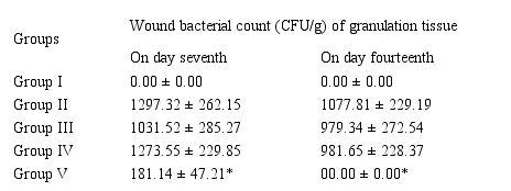 Microbiological assessments: Briefly, for total bacterial count on days 7 and 14 of treatment after wound creation the granulated tissues were excised aseptically. Then, 0.1 g of sample was crushed and homogenized in sterile mortar containing 10 ml of sterile saline. The homogenized sample was serially diluted in tube containing 9 ml of sterile saline to 10-5. The diluted samples were cultured on plate count agar (Merck KGaA, Darmstadt, Germany) superficially and duplicated. The cultured plates were incubated at 37 ºC for 24 to 48 hours. After incubation, all colonies were counted and results described as CFU/g of granulation tissue17.