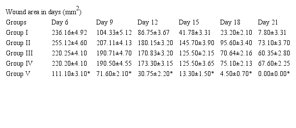 Reduction in wound area: Wound contraction percentage in different groups within the study period is shown in Table 2. The healing rate of wounds in group V was significantly different compared to groups III and IV (P= 0.001).