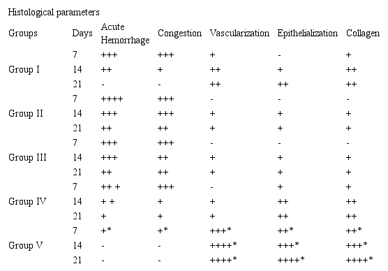 Classification of histological parameters according to the intensity of occurrence: - absence; + discrete; ++ moderate; +++ intense; ++++ very intense. Histopatological damages were assessed as explained under material and methods on days, 7, 14 and 21 of lesion.*P<0.05 vs. groups III and IV.