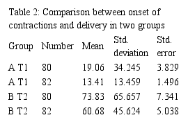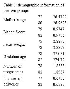 Results: Based on the performed studies, the two groups were found not significantly different in terms of mother’s age (P\0.589), number of pregnancies (P=0.905), number of deliveries (P=0.898), infant’s weight (P=0.989) and Bishop Score 9P=0.996), gestation age (P=0.332), education level (P=0.744), first minute Apgar (P=0.941), infant’s gender (P=0.800) and background diseases (P=0.440). These findings can be seen in (Table 1).