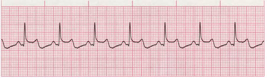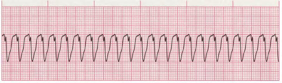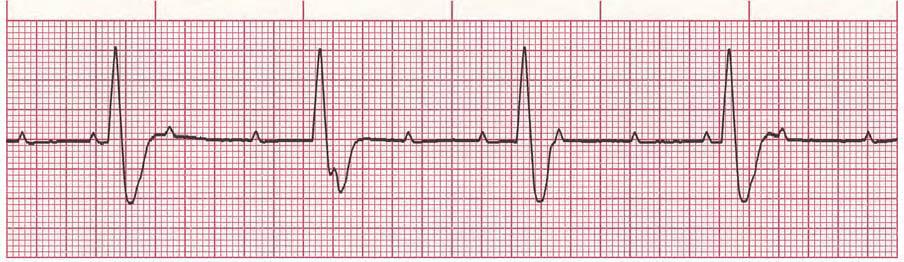 Scenario 2: As a CCU nurse, you notice that the patient on bed 4 has vomited and the patient declares that she is suffering from dizziness and blurred vision. You see the following rhythm in the patient's cardiac monitoring. How would you interpret this strip? What kind of intervention is required? (Figure 2)
