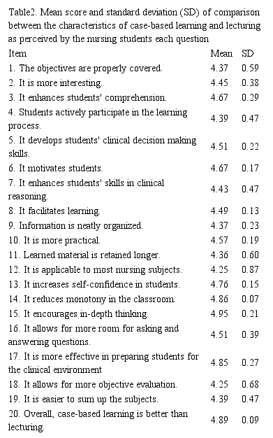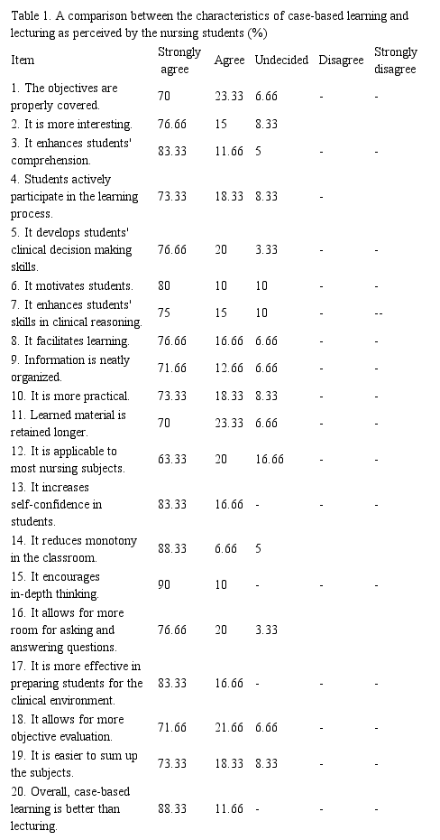 Results: 45 (75%) of the participants were female and 15 (25%) were male. The mean of their ages was 23.45±1.6. From the students' point of view, the most significant feature of case-based learning, in comparison with lecturing, was its capacity to improve comprehension of materials (Table 1). The results showed that there was not a significant difference between the genders in terms of their views on the characteristics of case-based learning (P>0.05).