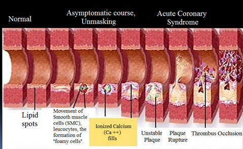 The progression of atherosclerotic plaque begins with the accumulation of lipids in the places of branching vessels. Macrophages capture lipids and invade the intima of the vessels, which is facilitated by adhesive molecules, inflammatory cytokines, and enzymes from the matrix metalloproteinase family. In response to lipid penetration and endothelial damage, platelets, SMC and lymphocytes secrete cytokines. This in turn stimulates most cells to form matrix metalloproteinases. Matrix metalloproteinase-9 causes extracellular matrix (EM) degradation, which facilitates the penetration of monocytes through the endothelium and their accumulation, and also creates opportunities for enhanced migration of SMC and activation of platelets and the coagulation cascade. Thrombosis on the surface of the damaged atheroma occurs due to the activation of platelets and the coagulation cascade on the platelet membrane. According to modern concepts, platelet activation begins with their adhesion (gluing) to the damaged deendothelized portion of the vessel, then they aggregate (stick) with the formation of the so-called primary platelet "plugs"6,7. The most dangerous manifestation of CHD is acute coronary syndrome (ACS). As is known, with complete occlusion of the lumen of the coronary artery, acute myocardial infarction occurs with an increase in the ST segment (AMIiST), in the case of non-occlusive thrombosis, the following options are possible: in the formation of necrosis, acute myocardial infarction without an increase in the ST segment (AMIwST), in its absence, unstable angina (UA)8.