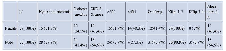 At the Moscow State City University Clinic named after M.P.Konchalovskiy of Moscow Health Department, patients admitted with transient elevation of the ST segment were divided into urgent invasive and delayed invasive strategies. An immediate revascularization strategy was chosen for 42 patients. The remaining 20 patients received the results of echocardiography, analyze, adjusted the factors that influence the poor prognosis - severe anemia, high levels of creatine, urea, potassium, etc. In the intraoperative and early postoperative periods, complications in two groups were not noted. In 51 patients, the long-term results presented in Table 3 (a, b) were evaluated. The primary endpoint is 6 months.