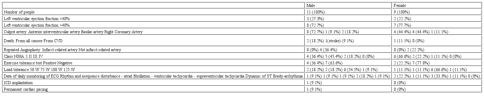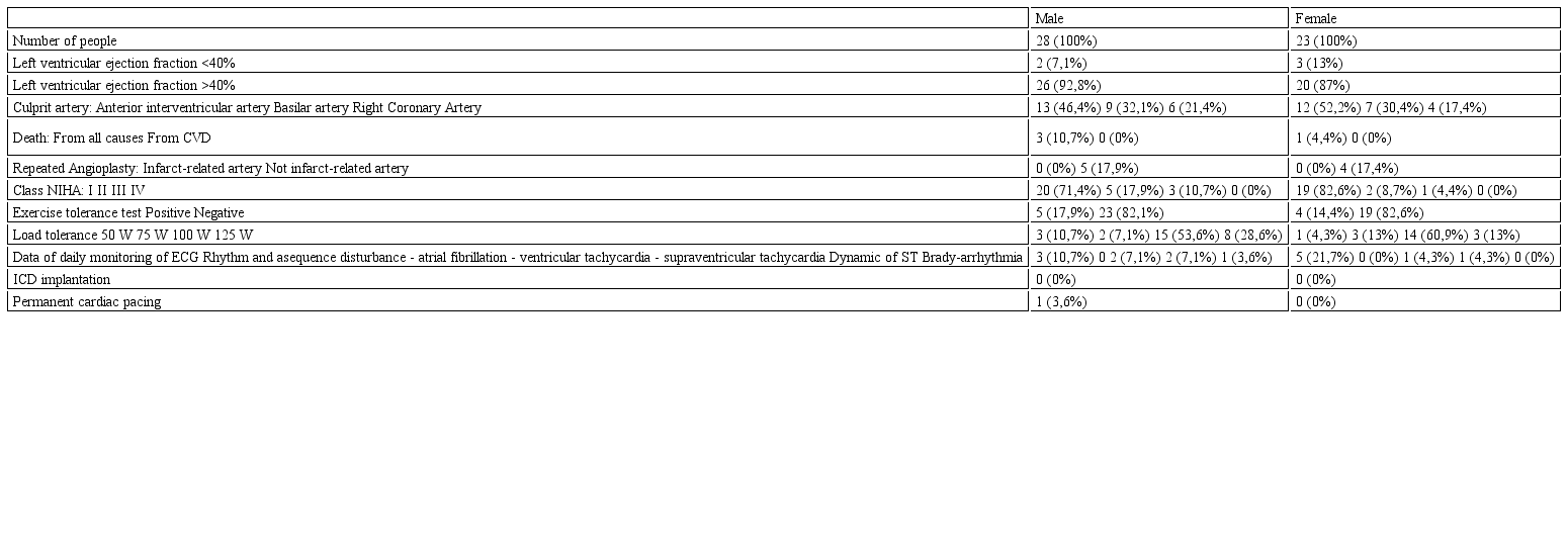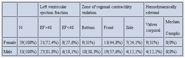 On admission, the ECG pattern in all patients varied from ST segment reduction of 70% or more to the return of the ST segment to the isoline. The pain syndrome was stopped prehospital with both narcotic and non-narcotic analgesics in all cases. At admission, each patient underwent a bedside Echocardiogram, no mechanical complications were noted, and various zones of violation of local contractility were identified (table 2).