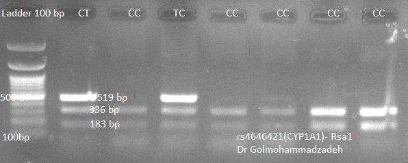 The polymorphic site of the CYP1A1(rs 4646421)(C—T intron)was determined by polymerase chain reaction-restriction fragment length polymorphism (PCR-RFLP). A 519 bpfragment containing C/T allele was amplified using forward and reverse primers that the specifications of primers and size of product and restriction enzymes of genes have been explained in Table2 .CYPP1B1 (rs1056836) (C-G Val 432 lucin) also simultaneously revealed by -Restriction Fragment Length Polymorphism (PCR-RFLP) PCR reaction was performed in a total volume of 50 μlcontaining 100 ng of genomic DNA, 200 μmoldNTPs, 2mM MgCl2, 1 × Taq polymerase buffer, 100 pmol ofCYP1A1 and CYP1B1 (primers and 1 U ofTaq DNA polymerase). There action conditions used with the thermal cycler were as follows for CYP1A1: initial denaturation at 95°Cfor 5min, 32 cycles of denaturation at 95 °C for 30sec, annealing at 62°C for 30 sec and extension at 72°C for 30 sec and a final extension at 72 °C for 10 min for CYP1B1 annealing set at 66.5 °C for 30 sec.To verify proper amplification conditions, 10 μlof PCR product was analyzed on a 2% agarose gel andstained with ethidium bromide, the amplification of which was revealed by the presence of bands. To detect CYP1A1 (C-T) and CYP1B1 (C-G) polymorphisms, amplified DNA was digested with 10 U of FastDigestRsaI(37°C, 5 min) and BsrI(65°C, 16h) restriction enzymes. In CYP1A1, the homozygote wild-type CCgenotypeproduce a two183 and 36bpfragments,homozygote mutated TT genotype results insingle band of 183bp length and heterozygote TC genotypeproduces three fragments of 519, 183and 336bpfragments (figure 1)and in CYP1B1, homozygote wild-type CC genotypeproducessingle band of 44bplength, homozygote mutated GG genotype results intwo44 and 171bp fragments and heterozygote GC genotypeproduces three fragments of 215, 171and 44bp fragments.
