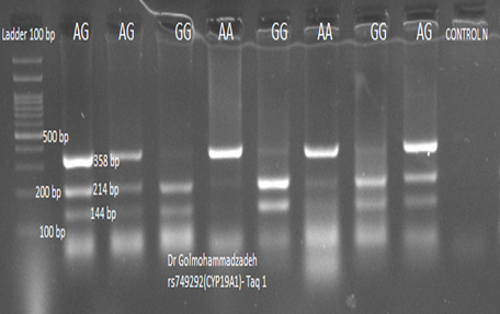 Digestion products were sep arated at the appropriate concentrations on a 2, 3 or 4% Low-melting point agarose gel and were stained with ethidiumbromide.The splice-site mutation of CYP19A1( rs749292 )(A-G intron) and CYP2C8*4 (rs1058930)(C-G exon5) was also analyzed by PCR-RFLP.PCR amplification also was performed the same as the above genes. The cycling conditions for both of genes including one pretreatment cycle denaturation at 94°Cfor 5min, 32 cycles of denaturation at 94 °C for 30sec, followed by annealing at 66 °C for 30 sec and elongation at 72°C for 25 sec and final elongation at 72 °C for 10 min.Products were analyzed by electrophoresis at 2%agarose gel and visualized by ethidium bromide staining. This amplified fragment was digested TaqI restriction enzyme at 65°C overnight and was analyzed on 2% agarose gel. CYP19A1,when digested with TaqI, the homozygote wild-type GGgenotyresultsin two144 and 214bp fragments, homozygote mutated AA genotype producesa single band of 144bpand heterozygote GA genotypeproduces three fragments of 358, 144and 214bp fragments( figure 2) whereas Digestion of CYP2C8yeilded band of 84bpand heterozygote GC genotypeproducesthree fragments of 303, 84 and 219bp.GSTP1gene was digested by AlW261 at 37°C overnight and we observed homozygote wild-type AA genotypeproducingsingle band of 173 bplength, homozygote mutated GG genotype resultsin two173 and 264 bp fragments and heterozygote AG genotypeproduces three fragments of 437, 173and 264 bp.Annealing time for this gene was 66 °C for30sec( Table 3)
