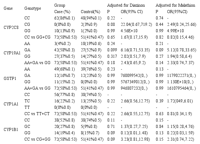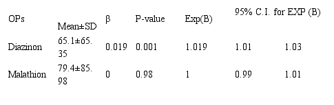 Regarding the results, after adjusting the regression model based on the serum level of diazinon and malathion, no double and triple of genotypes were found to have a significant relationship with the incidence of disease (Table 10).