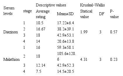 According to the results, the serum level of organophosphate diazinon and malathion did not differ significantly in different stages of the disease (Table11).