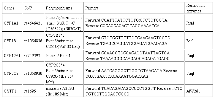 Previously reported primers andrestricted enzymes in RFLP-PCR are listed in Table 2. All PCR reactions were performed in an independent blinded duplicate manner and for each polymorphism, somesampleswere confirmed by sequencing the PCR products.