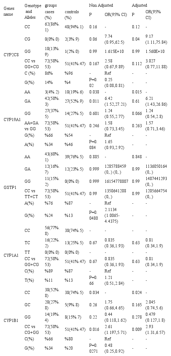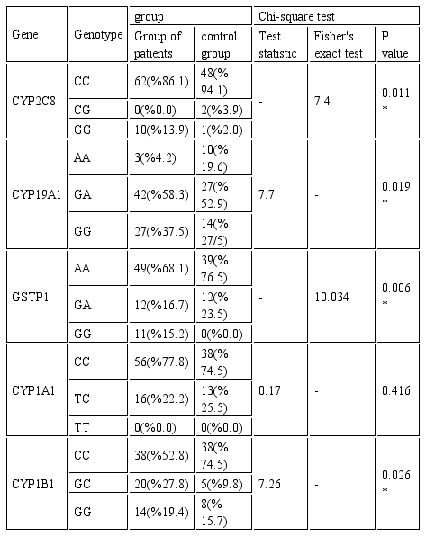 Regarding the distribution of genotypes, it can be said that the distribution of genotypes in two groups in CYP2C8 (P =0.11), CYP19A1 (P =0.019), CYP1B (P =0.026) ) had a significant difference, and they were homogeneous only in CYP1A1(p =0.416) (Table4).