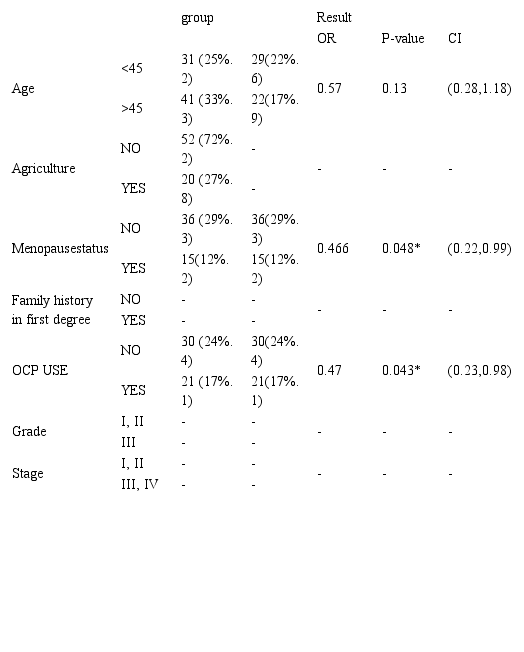 In the case group, the frequency of level education waslower than diploma and difference wassignificant (p <0.001). The majority of cases hada pregnancy in the patient group and the difference between two groups was significant (p=0.036).Regarding the menopause status,the majority of cases werenot at the menopausestatus(p(047/0=.In cases groups, the majority of people used LD tablets and the difference between the two groups was significant (p=0.043). About the stage of cancer, the majority of patients were in stage 2 (p <0.001)and Grades of tumors were mostly reported in Grade 2 (p <0.001). Regarding the agricultural occupation, few people were in cases group (p <0.001). About the family history of cancer, the majority of patients in the first-degree subjects had no history of cancer in their family (p <0.001).