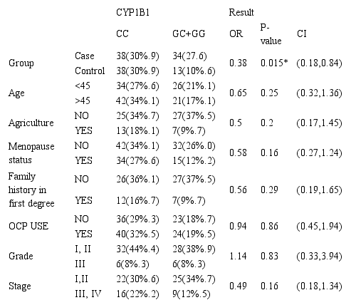 It can be said that CC genotype of CYP1B1decreasedthe risk of breast cancer about 0.38 time in comparison to the CG + GG genotype. In addition, about the correlation between CC and CG + GG genotypes with demographic and clinical variables such as age (P-value = 0.25), agriculture (P-value = 0.2), menopause (P = 0.16) (P-value = 0.29), LDL consumption (P-value = 0.86), tumor grade (P-value = 0.83), and stage of cancer(P-value 0.16) =), there was no significan trelationshipamong two groups (Table 7).
