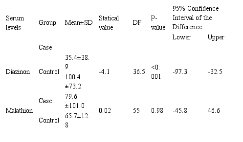 According to the results of serum levels of Diazinon and Malathion, it can be concluded that the mean serum level of diazinon in both case and control groups was statistically significant (p <0.001). According to the mean+̲ SD serum level of this poison, it can be concluded that diazinon in the case group hada much lower level than the control group(Table 8).