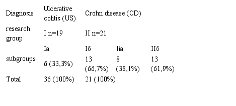 After a comprehensive examination of patients and verification of the diagnosis of IBD, in accordance with the inclusion and exclusion criteria, two research cohorts were formed: I cohort - 19 patients with relapse of UC (12 - women and 7 - men), aged 23-70 years (mean age 39.0±1.4 years) and II research cohort - 21 patients with relapse of CD (14 - women and 7 - men), mean age 42.6±3.2 years. Patients I cohort depending on the location of the inflammatory process were ranked into 2 groups: Ia - 6 (33.3%) patients with distal UC, and IB - 13 (66.7%) patients with a total form of the disease. Patients in study cohort II were divided into 2 subgroups depending on segmental localization of intestinal lesion: IIA subgroup - 8 (38.1%) patients with colonic localization, IIB subgroup - 13 (61.9%) patients with combined lesions of the colon and small intestine. The control group consisted of 30 healthy volunteers (20 women, 10 men), average age - 27.4±5.7 years.