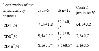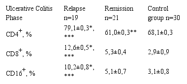 The mean values of CD4+ cells during relapse of UC were 79.1±0.3%, which exceeded 1.2 times the values during remission (p<0.05). The expression level of CD4+ was 1.5 times higher than in the remission phase and was 3 times higher in comparison with the control group. The increase in CD4+ was 10.2±0.8%, which was 2.4 and 3.1 times higher, respectively than in the period of remission of UC and in the group of healthy volunteers (p<0.05).