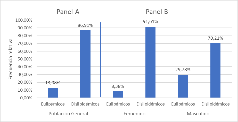 El total de individuos con algún tipo de dislipidemia fue de 86,91% (n=186), mientras que 13,0% (n=28) presentaron un perfil lipídico normal, es decir, fueron eulipémicos (Figura 1, Panel A), donde al discriminar por sexo, el 91,61% de las mujeres y el 70,21% de los hombres presentaron dislipidemias (Figura 1, Panel B).