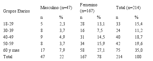 El estudio incluyó un total de 214 individuos los cuales presentaron un promedio de edad de 50,22± 16,4 años, con una edad mínima de 18 años y edad máxima de 89 años. Al distribuirlos según el sexo se observó que el 22% (n=47) fueron hombres y 78% (n=167) mujeres. Al distribuir la muestra estudiada según grupos etarios con intervalos de 10 años, la mayor parte de la muestra estuvo concentrada en el grupo de 60 y más años (n=35,03%), el de 50-59 años (n=19,6%) y en el de 40-49 años (n=18,7%). En cuanto a la relación edad y sexo se observó un predominio de mujeres mayores de 60 años. En la tabla 1 se muestra la distribución de la población estudiada según grupo etario y sexo.