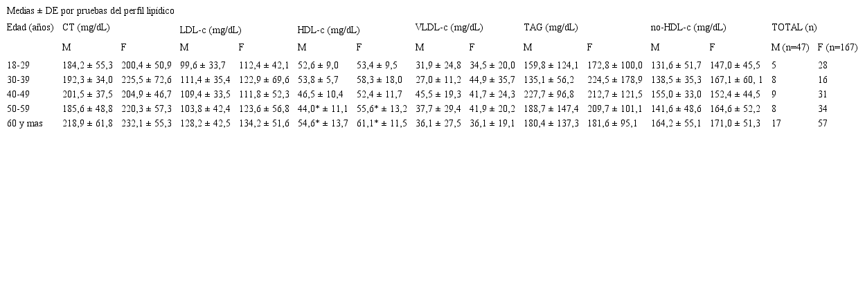 Methods: Descriptive, non-experimental, and cross-sectional study. We evaluated 214 individuals older than 18 years, who were determined serum levels of total cholesterol, triacylglycerides, and HDL-c by conventional methods. The LDL-c and the VLDL-c were calculated by the Friedewald equations. If the TAG was greater than 400 mg/dL, the LDL-c concentration was determined directly. The variables were expressed in absolute and relative frequencies, mean±standard deviation, and as a hypothesis test the Student t test according to the case, accepting a .<0.05 as statistically significant.