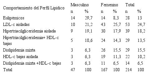 Results: 78% of the sample corresponded to the female sex. The arithmetic mean of age was 50.22 ± 16.4 years. The general prevalence of dyslipidemias was 86.9% (n=214), being 91.6% in women and 70.2% in men; only 13.0% (n=28) of the individuals were eulipemic. The frequency of the dyslipidemias observed was: isolated high LDL-c 24.7%, isolated hyperthercylglyceridemia 18.2%, hyperthercylglyceridemia with low HDL-c 13.5%, mixed dyslipidemia 13.5%.