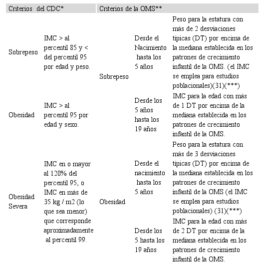 Tabla 1. Criterios diagnósticos para sobrepeso y obesidad según el CDC (2000) y la OMS (2016)