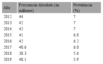 En el año 2004, la 57ª Asamblea Mundial de la Salud (el órgano decisorio supremo de la OMS) celebrada en el Palais des Nations (Ginebra, Suiza) con la asistencia de más de 2000 delegados de los 192 Estados miembros de la OMS aprobó la Resolución WHA55-23 para la aplicación de estrategias para mejorar el régimen alimentario, actividad física y la salud, en conjunto con sus colaboradores (UNICEF y Banco Mundial) de forma el sobrepeso y la obesidad infantil detuvieran su aumento en el mundo para el año 2012, mediante un aumento de la atención y la inversión en esta área42,49. Gracias a esta iniciativa se empezaron a reportar estimaciones anuales de la prevalencia de sobrepeso y obesidad desde el año 2012 dentro de los informes sobre malnutrición infantil. En general, en los dichos informes reportaron que entre los años 1990 y 2012, la prevalencia de sobrepeso y obesidad se ubicó en un 4% en países de bajos ingresos económicos y de un 8% en países con altos ingresos económicos, y observándose con preocupación que los países de bajos ingresos poco a poco tendían a alcanzar a los países con altos ingresos (Véase tabla 2)50. Datos más recientes de la OMS (2016) ubicaron la prevalencia mundial de sobrepeso y obesidad infantil en un 6.2% por lo que unos 42 millones de niños tenían sobrepeso y obesidad en el orbe51. En el último informe publicado en el 2019 (con los datos correspondientes al año 2018) la prevalencia de sobrepeso y obesidad fue de 5.9%, que representan 40.1 millones de niños en todo el mundo, lo que pone en evidencia que la prevalencia global ha variado poco en la última década; sin embargo, un problema que reviste atención y que debe manejarse de forma inmediata es que tal como se mencionó, su prevalencia está aumentando en aquellos países con ingresos medios y bajos, mientras que en algunos países de ingresos altos se ha mantenido e incluso ha disminuido (52–54), (Ver Tabla 2).