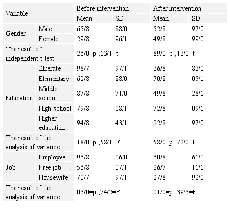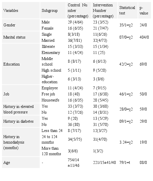 Findings: The findings showed that of all the sample studied (89), 52 were male and 37 were female and also showed that 68 were married and 21 were single. The average age of the sample was 43±15. Independent t-test did not show any significant difference between research groups in terms of age. Most of the sample were male, married, illiterate, and housewife. According to the chi-square test, research groups did not show any significant difference in terms of demographic variables of gender, marital status, education, and job and they were homogenous. Also, about information related to the disease, most of the units had a history of elevated blood pressure but did not show a history of diabetes. The chi-square test did not show any significant difference in terms of the mentioned variables and the groups were homogenous in this regard (Table 1).