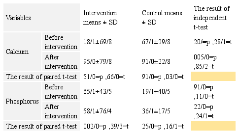 Table 2. Comparison of the mean and standard deviation of calcium and phosphorus before and after the intervention for each group