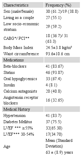 This study collected social-demographic and clinical data. Cardiac rehabilitation program (CRP) starts with a review of the clinical history made by the cardiologist. For the evaluation of the health-related quality of life, SF-36 questionnaire was used. This questionnaire has 36 questions that address two major components based on 8 fields: a physical component which includes physical functioning, physical performance, pain, and general health, and the mental component which includes vitality, social function, emotional role and mental health18,19. To calculate the score, the items for each one of the eight dimensions are encoded, added and transformed into a scale from 0 (worst health status for this dimension) to 100 (best health status).