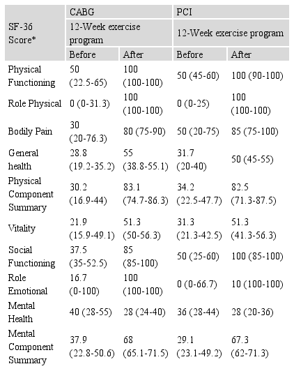 Table 4 shows that there are no significant differences among patients with CABG compared to PCI. As shown in Table 5, the quality of life before and after 12-WPEP in LVEF 30-54% versus LVEF 30-54% are similar and statistically significant (p<0.05) in each group. However, although some components of the SF-36 quality questionnaire were found to be higher in subjects with LVEF> 55%, no significant differences exist among patients with LVEF 30-54% or those with LVEF ≥55% (Table 5).