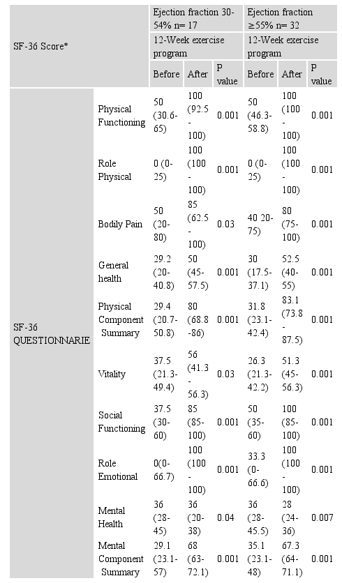 Table 5. Quality of life differences among patients with ejection fraction (EF) 30-54% compared to patients with EF ≥ 55% measured by 2D-echocardiography before and after 12-week physical exercise program (n=49).