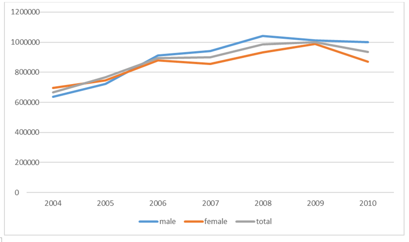 During the 8-year period in Iran, 38712, cases (21608, men (55.8%) and 17104 women (44.2%) with colorectal cancer were recorded; this rate had increased from 2882 cases in 2003 to 6,215 cases in 2010. More than half of the cases were reported between 2006 and 2010. The mean±SD average age of all the cases was 56.5±13.04 yrs., which was 56.5±13.5 yrs. and 57.6±15.39 yrs., in females and males, respectively. The incidence rate was significantly increased from 6.48 in 2003 to 9.34 cases per 100,000 persons in 2010 in Iran (Table 1). This rate increased from 6.22 in 2003 to 9.99 in 2010 cases per 100,000 persons in males, and from 6.74 in 2003 to 8.69 cases per 100,000 persons per year in 2010 in females (Table 1). Similar changes were observed in the incidence rate in both genders, representative that the age incidence rate had declined in both genders in 2010. (Figure 1). Colorectal cancer incidence rate was higher in females than in males until 2006, and after this date, males experienced a higher incidence (Figure 1).