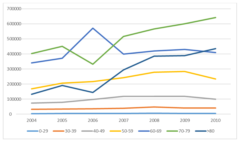Comparison of the incidence trend in different age groups showed that the incidence rate was the minimum in the younger age groups, but it increased in older age groups. This increase was more obvious after the age of 40 and its maximum was observed in those over 70 years of age, as the age incidence rate in this group had increased from 36.74 in 2003 to 64.13 per 100,000 persons per year in 2010 (Table 2). The change was slight in younger age groups (younger than 29 yrs.) but it decreased slightly and then increased in the over 50-year-old groups (Figure 2). The incidence rate has increased from the young to the old age groups (Figure 2).