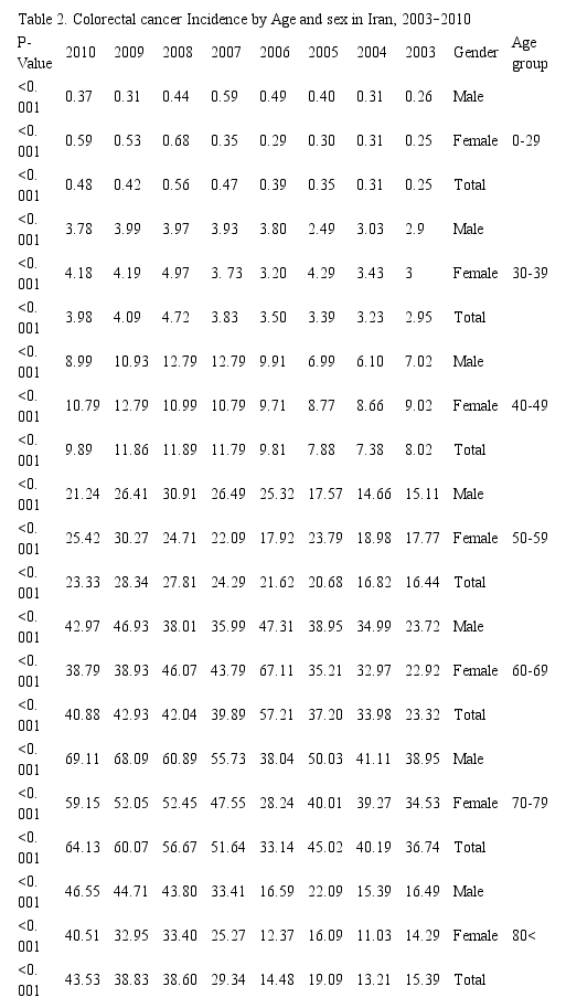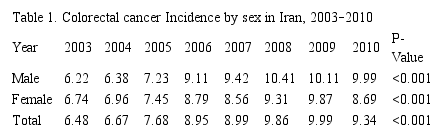 Introductionand and Background: As the third leading reason of death, cancers have a special place in the Iranian health system. This study to investigate the incidence trends of colorectal cancer in Iran from 2003 to 2010.