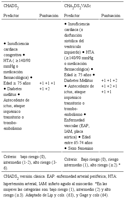 Tabla 1. Escalas para la evaluación del riesgo de eventos trombo-embólicos en pacientes con fibrilación auricular.