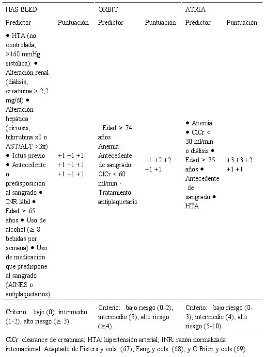 Tabla 2. Escalas para la evaluación del riesgo de hemorragia en pacientes con fibrilación auricular.
