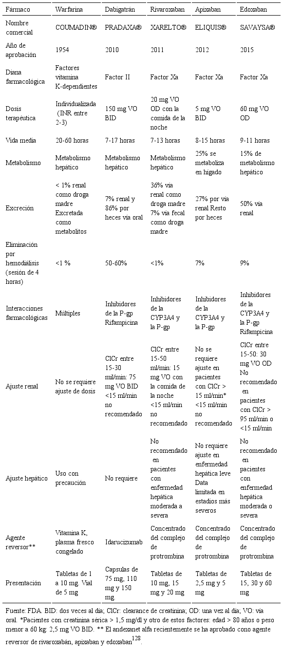 Los nuevos anticoagulantes orales no vitamina-K dependientes (NOACs) son referidos actualmente también como anticoagulantes orales de acción directa (DOACs) y están agrupados en dos familias farmacológicas: a) los inhibidores directos de la trombina como el dabigatrán; b) los inhibidores del factor Xa como rivaroxaban, apixaban y edoxaban (Tabla 3). Betrixabán es el quinto fármaco NOACs, pero no ha sido aprobado por la FDA para uso en pacientes con FA (aprobado para profilaxis de trombo-embolismo venoso) y se ha completado la fase II en ensayos clínicos94. Estos fármacos tienen como ventaja que no requieren el monitoreo continuo de la terapia a través del INR, a diferencia de la warfarina, además de tener menos interacciones farmacológicas95.