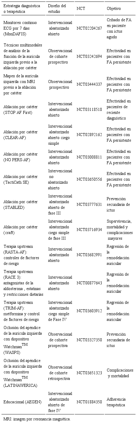Tabla 4. Ensayos clínicos en curso que evalúan nuevas estrategias diagnósticas y terapéuticas en pacientes con fibrilación auricular.