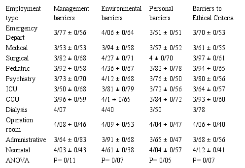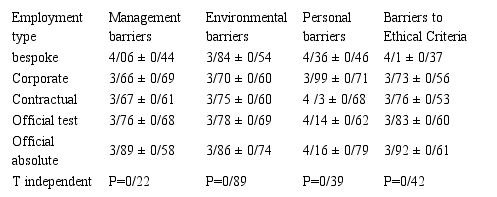 Study as a cross-sectional study, the information of barriers to professional ethical nursing practice is provided. In this study of 184 patients, 152% (6/82) of women and 32% (4/17) were men. Among these patients, 35 (19%) were single and 149 (81%) were married. Minimum age of 23 and a maximum of 55 years studied, the average age of 67/6±42/32 years. The minimum working experience of the studied samples is 1 year and maximum 25 years, with an average working experience of 8.34±5.88 years. Based on statistical results, 171 (92.9%) had undergraduate degrees and 13 (7.1%) had master's degrees. Among the subjects, 177 (96.2%) nurses, 3 (1.6%) nurses and 4 (2.2%) supervisors were nurses. The results of the study showed that there was a significant relationship between observing ethical criteria with age (P=0.57), gender (P=0.75), educational level (P=0.57), position (p=0.93) and marital status (P=0.38). There is no significant statistical relationship. Table 1 shows the relationship between service sector and professional ethics, which did not show a significant relationship between the service area and ethical standards (P=0.07). In the statistical results of Table 2, employment status was not correlated with ethical standards (P=0.42). The results of the study indicate that the average barriers to observance of professional ethics standards in clinical care from nurses' point of view was 3.81 ± 0.56, which, considering the maximum average5, has barriers to observing professional ethics standards in clinical care. The average of these barriers in different domains were: environmental barriers with a mean of 4.10 ± 0.66, management barriers with a mean of 3.77±0.64, and then individual barriers with an average of 3.75±0.65.