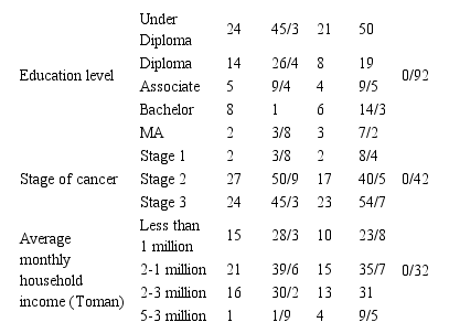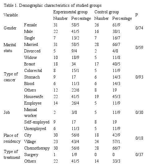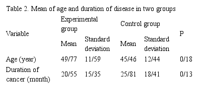 In this study, the majority of patients were female (58.5%) and married. Meanwhile, the most common type of cancer was breast cancer and they were mostly homemakers. The chemotherapy was the most common type of treatment. The chi-square test showed that there was no significant difference between the two groups in terms of gender, type of cancer, and place of residence. The chi-square test with likelihood ratio showed that there was no significant difference between the two groups in terms of the marital status, occupation, and type of treatment. Most patients were in stage 3 of cancer (54.7%) (Table 1). The independent t-test showed that there was no significant difference between the two groups in terms of age mean and duration of disease (Table 2).