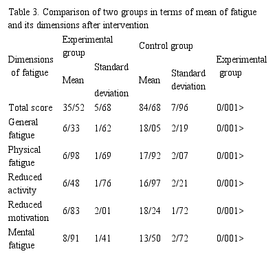 The independent t-test showed that after the intervention, the mean of total fatigue score and all of its dimensions was significantly lower in the experimental group (35.52±5.68) than the control group (84.68±7.96) (P< 0.001) (Table 3).