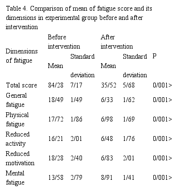 The paired t-test showed that after the intervention, the mean of total fatigue score and all its dimensions was significantly lower in the experimental group (35.52±5.68) than before the intervention (84.28±7.17). Before the intervention, the experimental group reported a high fatigue rate, while after the intervention, the fatigue was reported to be moderate (P<0.001) (Table 4).
