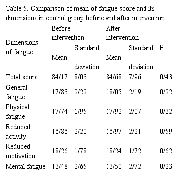 The paired t-test showed that in the control group, there was no significant difference in the mean of total fatigue score and its dimensions before and after the intervention (Table 5).