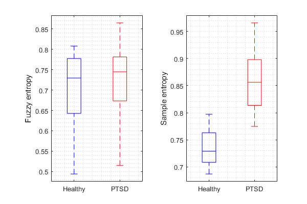 Before feature extraction we filtered EEG signals with middle-pass Butterworth filter between 0.5 and 45 Hertz with order of two. In the next step, we extracted sample and fuzzy entropy from all 31 EEG channels for both normal and PTSD subjects with common values (r=0.2*std (EEG) and n=m=2).