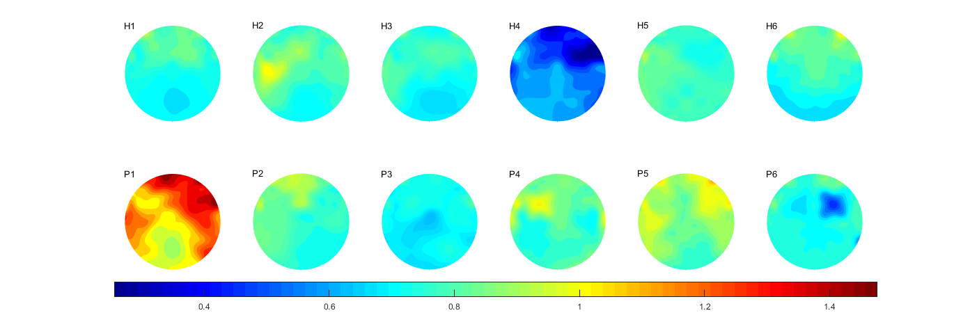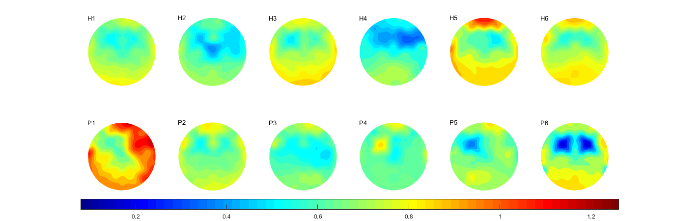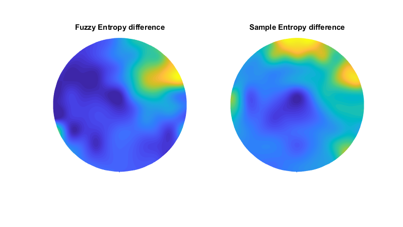 Figure 2 and Figure.3 illustrates the brain map of sample entropy and fuzzy entropy of six healthy subjects and six subjects with PTSD disorders. Entropy values are color coded the way dark red colors indicates higher entropy value and in opposite, dark blue colors indicate smaller entropy values. There are two rows in each figure (Figure 2 and Figure 3), the first row shows brain maps of six healthy subjects (H) and second row shows brain maps of six patients (P) with PTSD disorders. By comparing brain maps of two normal and PTSD groups, we can conclude that channels which are located in frontal lobe of the brain, are the channels with most influences in PTSD disorder. Figure 4 shows the entropy difference between healthy and PTSD groups in all 31 EEG channels. EEG channels which are colored with bright yellow, are the channels with higher entropy differences and channels which are colored with dark blue, are the least important channels with less entropy differences between healthy and PTSD groups. Channels which are located in frontal lobe of the brain showed higher entropy differences between healthy and PTSD groups. This results proves the fact that frontal lobe of the brain plays an important role in emotional experience of a subject19,20,22. Among all 31 available EEG channels, FP1, FP2 and FC6 are the channels with higher sample entropy differences and channel FC6 is the channel with higher fuzzy entropy difference between healthy and normal groups23. The sample entropy showed entropy differences in three channels (FP1, FP2 and FC6) which are located in frontal and right hemisphere of the brain so in compare to fuzzy entropy, is better tool for PTSD diagnosis problems. In the central part of the brain, the sample and fuzzy entropy had the smallest difference between healthy and PTSD subjects so the channels which are located in this region is not effective for PTSD detection problems.
