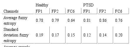 In Table.1, we reported the mean and standard deviation of sample and fuzzy entropy of six healthy and PTSD subjects for three best channels (FP1, FP2 and FC6) which had the biggest entropy differences based on our previous results. In Table.1, the sample entropy of subjects with PTSD disorder is within 0.91 to 0.94 which is about 0.2 higher in compare to healthy subjects. This results indicates the fact that entropy values and so the EEG signals irregularity of subjects with PTSD disorder is higher in compare to healthy subjects. Also the average Fuzzy entropy of three bets channels (FP1, FP2 and FC6) in PTSD group is slightly higher in compare to healthy group but this difference is not the same as it was for sample entropy which shows the superiority of sample entropy in compare to fuzzy entropy.