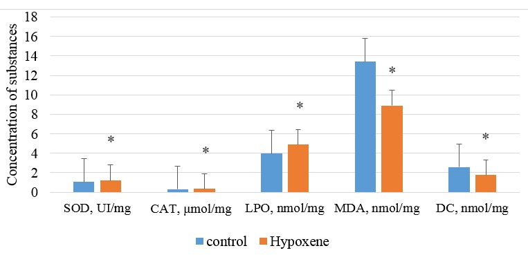 Abstract: This study aimed to compare the effect of treatment with hypoxene and standard medical treatment for the oxidative stress (catalase (CAT), lipid peroxidation (LPO), inhibition of superoxide dismutase (SOD), diene conjugates (DC) and malondialdehyde (MDA) at the admission and at the end of treatment in hospital, after 6 months, 1 year in patients with CFH. This prospective study included 158 patients with CHS who were treated at the State Budgetary Institutions "Clinical Hospital № 1 of Grozny" and "Clinical Hospital № 5 of Grozny" in 2017. All the patients divided into two groups. Group A treat hypoxen and standard medical therapy, and Group B – non-treat hypoxene and standard medical therapy, as a control group. The patients of group A were then given 750 mg/d hypoxene for 4 weeks. Blood samples were collected from the patients on admission and at the end of the study, after 6 months, 1 year. Mean age of group A patients were 49±6.3 years while in control group it was 51±9.4 years. There were 48 males in group A patients and 43 males in control subjects. The levels of LPO were found to be significantly increased in group A patients compared to control (P< 0.05). The catalase, MDA, DC and SOD levels were significantly decreased (P< 0.05) in group A patients compared to controls. During the treatment of patients of the studied groups showed a significant decline in lipid peroxidation.