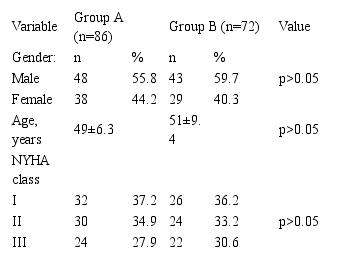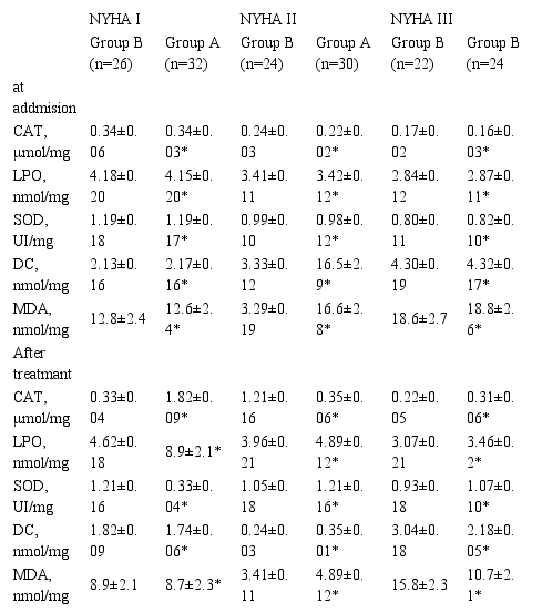 This prospective study included 158 patients with CHS who were treated at the State Budgetary Institutions "Clinical Hospital № 1 of Grozny" and "Clinical Hospital № 5 of Grozny" (mean age 46.23±17.81 years) in 2017. Diagnosis was based on clinical, radiological, endoscopy and histological findings. All the patients divided into two groups. Group A treat hypoxen and standard medical therapy, and Group B – non-treat hypoxene and standard medical therapy, as a control group. Baseline heart function tests were performed in each patient. The patients of group A were then given 750 mg/d hypoxene for 4 weeks. Patients were hospitalized and the treatment was continued until the symptoms and signs of volume overload disappear. Blood samples were collected from the patients on admission and at the end of the study, after 6 months, 1 year.