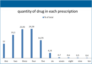 The most quantity of drugs was four type drugs in each prescription. Between one and ten drugs type prescribed in total of papers. Distribution of drugs numbers in each prescription was summarized in figure 2.